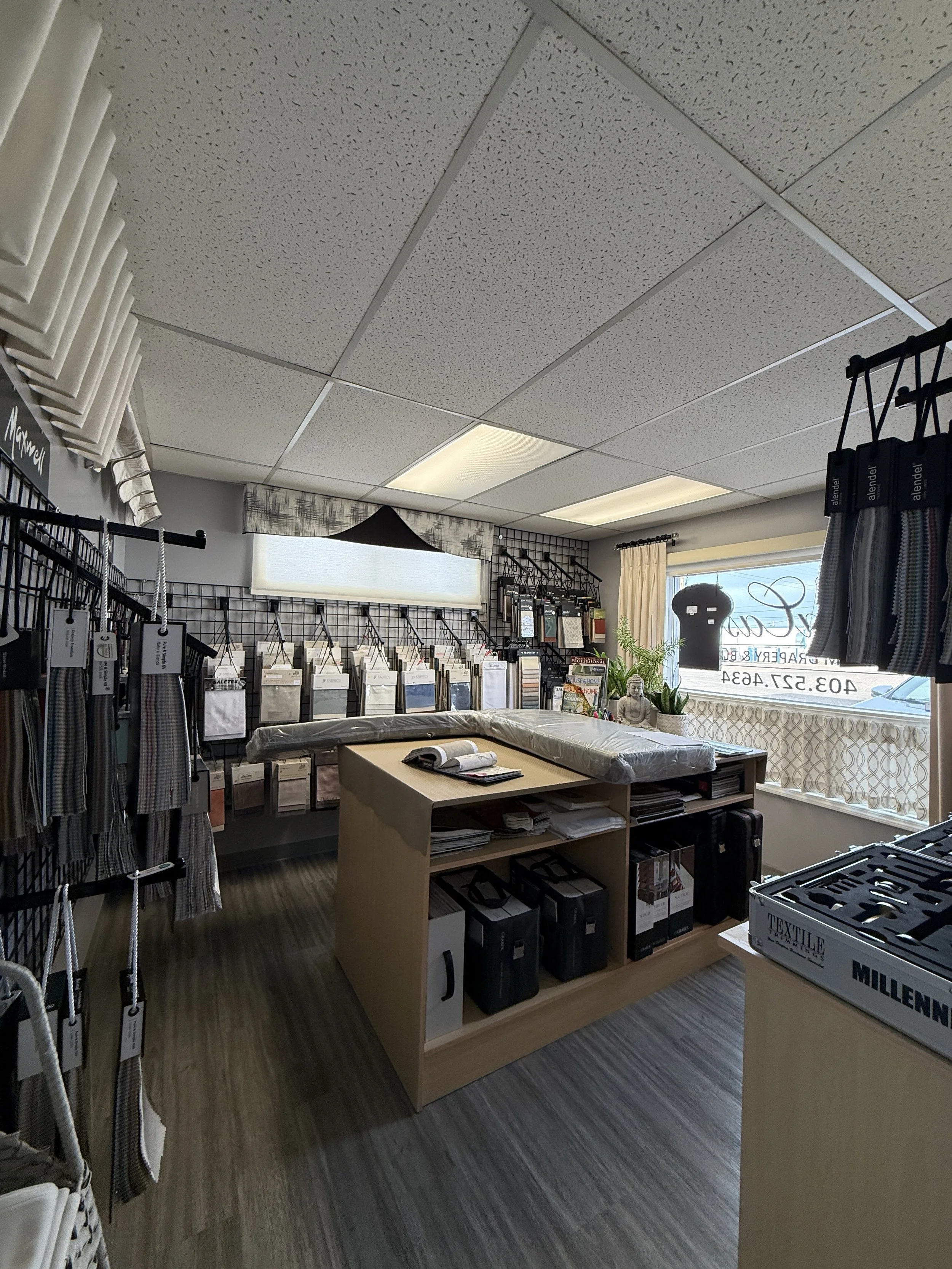 Our fabric showroom and workroom are the heart of La Casa Drapery. We invite you to explore our wide range of fabrics, trims, and textures while seeing firsthand how each piece is crafted with care. Every window treatment is made locally in Medicine Hat, blending timeless style with quality you can trust